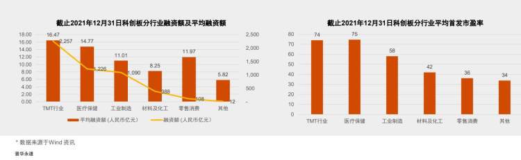 除科创板外,A股上市TMT企业的平均市盈率由2021年6月30日的44倍,降至2021年12月31日的41倍,但依然较高。而2021年年底在科创板挂牌上市的137家TMT企业总融资额为人民币2257亿元,平均首发市盈率74倍,是所有行业中最高的,该行业平均融资规模也居科创板之首。