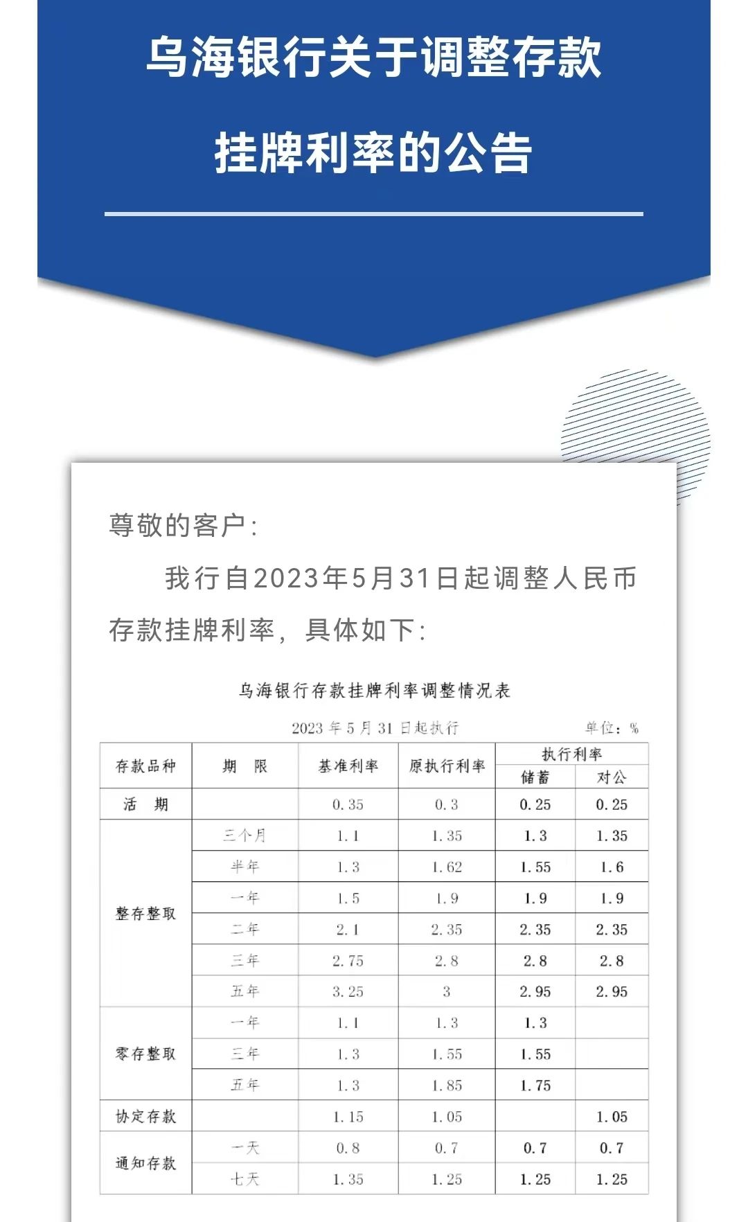 从5月31日开始,内蒙古乌海银行3个月、半年、5年储蓄存款执行利率分别由1.35%、1.62%、3%降至1.3%、1.55%、2.95%。