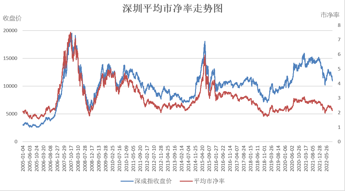 深圳交易所A股平均市净率(PB)为2.13倍,其中历史最大值7.5,历史最小值1.56,当前市净率在历史数据上的分位数为12.81%,同样处于历史低位。