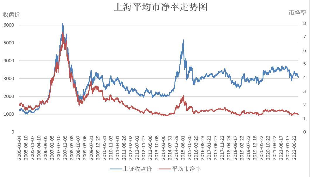 上海交易所A股平均市净率(PB)为1.28倍,其中历史最大值7.34,历史最小值1.19,当前市净率在历史数据上的分位数为3.20%,仅高于2014年熊市末期的值,与2005年熊市末期、2018年熊市末期的值相当。