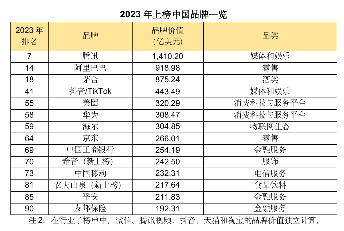 具体来看,中国今年依然有14个品牌上榜,包括腾讯、阿里巴巴、茅台、抖音/TikTok、美团、华为、海尔、京东、中国工商银行、希音、中国移动、农夫山泉、平安、友邦保险。