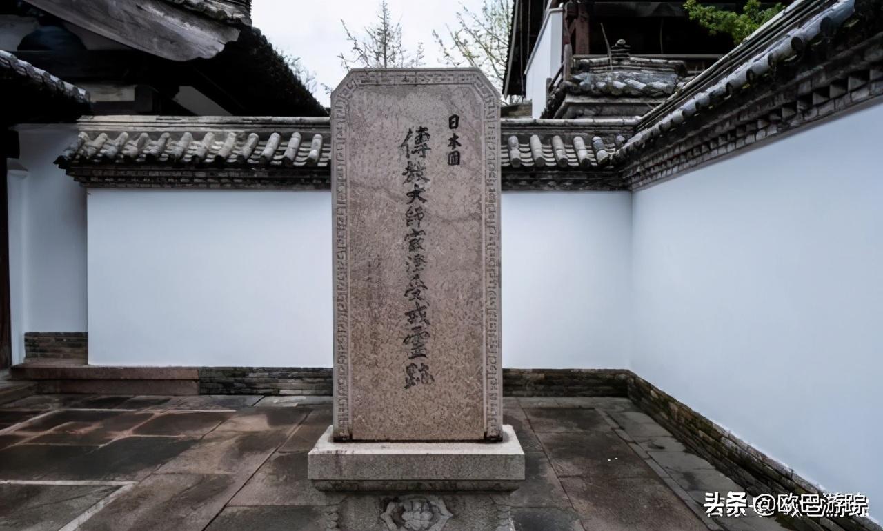 石碑正书“传教大师最澄受戒灵跡”,背书“大唐贞元二十一年(公元八〇五年)三月二日初夜,于此处台州龙兴寺西厢极乐净土院,天台山修禅寺座主道邃大和上授最澄和尚天台菩萨戒灵跡也。”