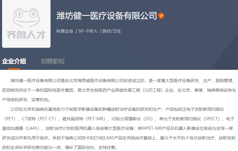 来自一家国内著名招聘网站介绍,潍坊健一医疗设备有限公司是由北京海思威医疗设备有限公司投资成立的,是一家集大型医疗设备研发、生产,医院管理、药品物流供应于一身的国际性医疗集团,是北京生物医药产业跨越发展工程(G20工程)企业,在北京、香港、瑞典等地设有生产场地和研发、运营机构。
