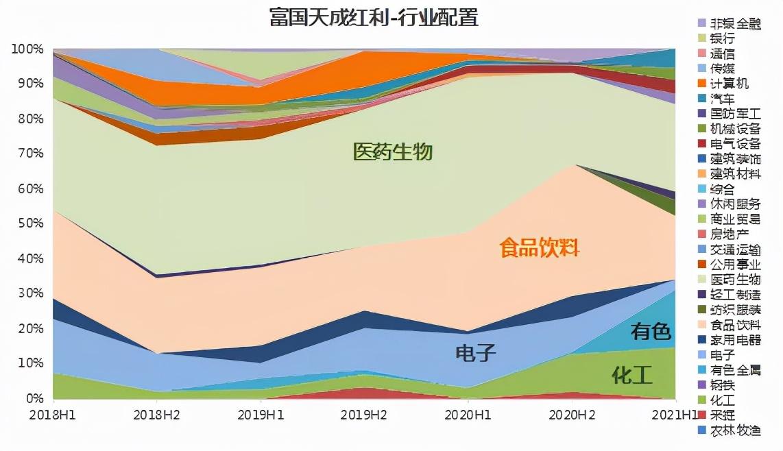基金定期报告显示,基金于2021年二季度适度减仓医药、食品饮料,同时加仓有色金属、化工等行业配置比重;在2021年上半年大幅波动的市场环境中,富国天成红利仍然取得了