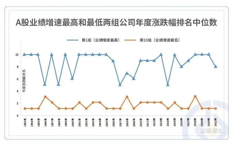 纵观过去30年,将每年全部A股业绩增速从高到低分为10组,计算每一组的年度涨跌幅中位数,