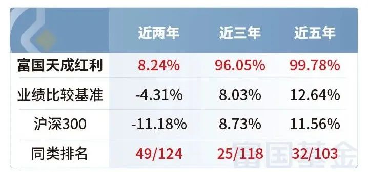 富国天成红利近两年、近三年、近五年净值增长率分别为8.24%、96.05%、99.78%,同期业绩比较基准收益率分别为-4.31%、8.03%、12.64%,超额收益显著。