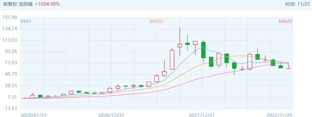 随着锂电材料产品营收比重的不断增加,天华超净的净利润迎来大幅上涨,从2020年的不到3亿元,增至2021年的12.5亿元,而在今年前三季度,这个数字更是达到69亿元,同比增幅高达836%,其股价也从2020年9月的14.6元/股,增至2021年同期高点的136.65元/股,涨幅超800%。
