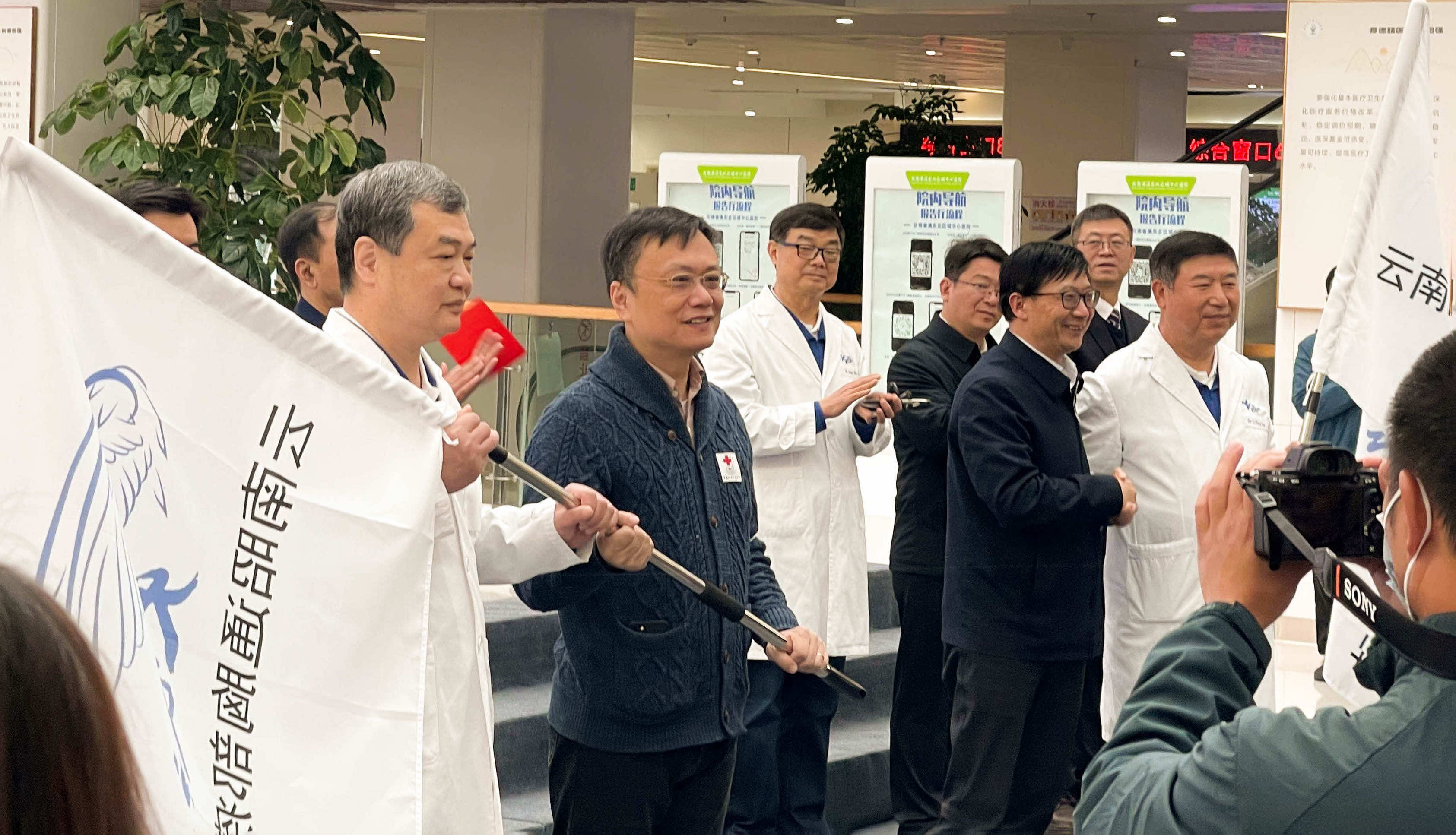 中国红十字基金会副秘书长郭阳,云南省红十字会党组书记、常务副会长彭耀民为医疗专家团队授旗