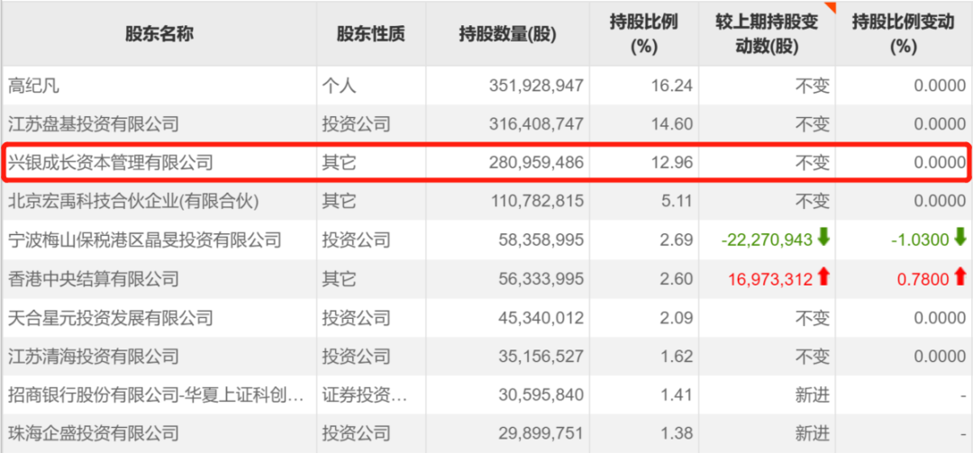 如上图所示,我用红色框框标记的,“兴业成长资本管理有限公司”持股12.96%位列第三名,仅次于创始人高纪凡。