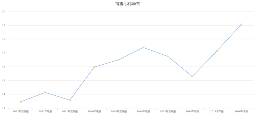 毛利率就没高于20%过,而且还在逐年下滑,2016年还有19%得毛利率,如今仅仅才13.5%。