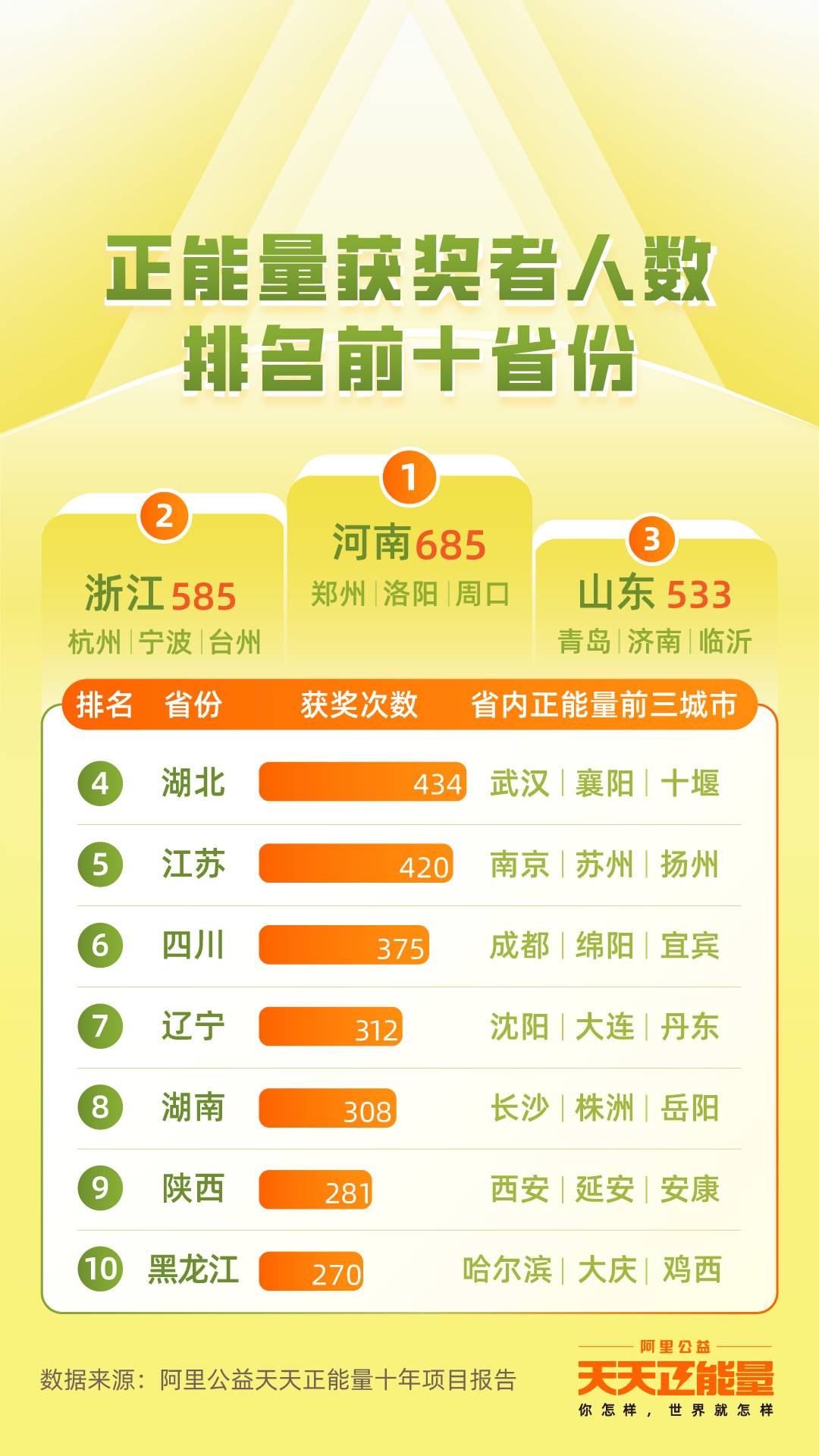 而河南、浙江、山东、湖北、江苏、四川、辽宁、湖南、陕西、黑龙江,成为十大获得正能量奖次数最多的省份,其中河南获奖人数全国第一。