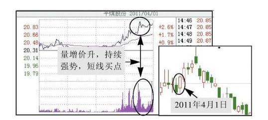 从图中可以看出,全天股价和成交量都很平淡,突然在尾盘时成交量急速放大,股价也被拉高,呈现出量增价升的态势。再对应到该日的K线图可以看出,股价经过几日上涨后就开始下跌,短线投资者可在此买入,然后在股价走软时卖出。