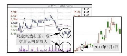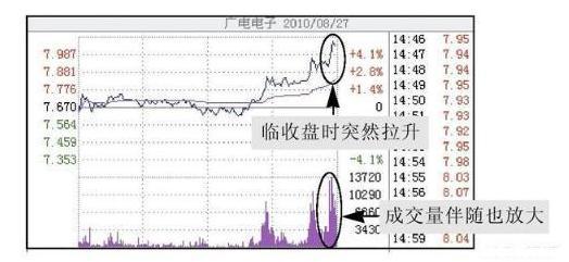 从图中可以看出,全天股价和成交量都很平淡,突然在要收盘前几分钟股价被拉得很高。