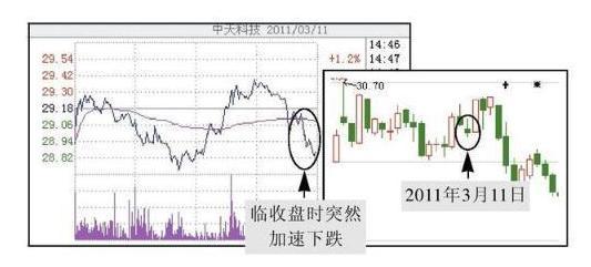 从图中可以看出,全天股价起伏很大,临收盘时突然加速下跌。结合K线图可以看出当日K线出现在高位区域,并且没过几日股价就开始下跌,是主力出货的前兆。