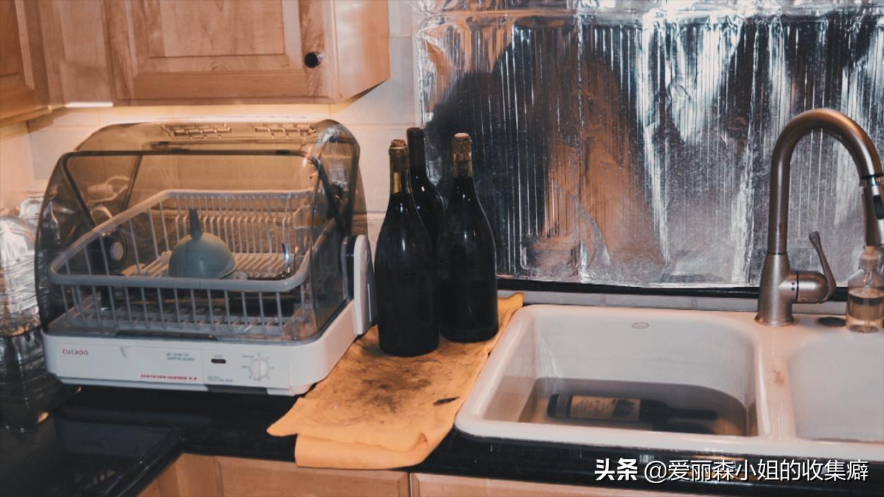 水槽里泡着几个葡萄酒瓶,标签被浸掉;