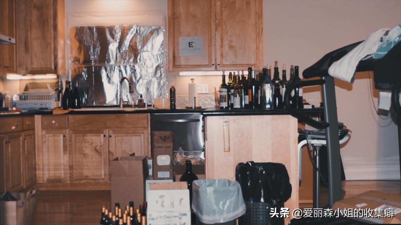 从客厅到厨房堆满了空的葡萄酒瓶;