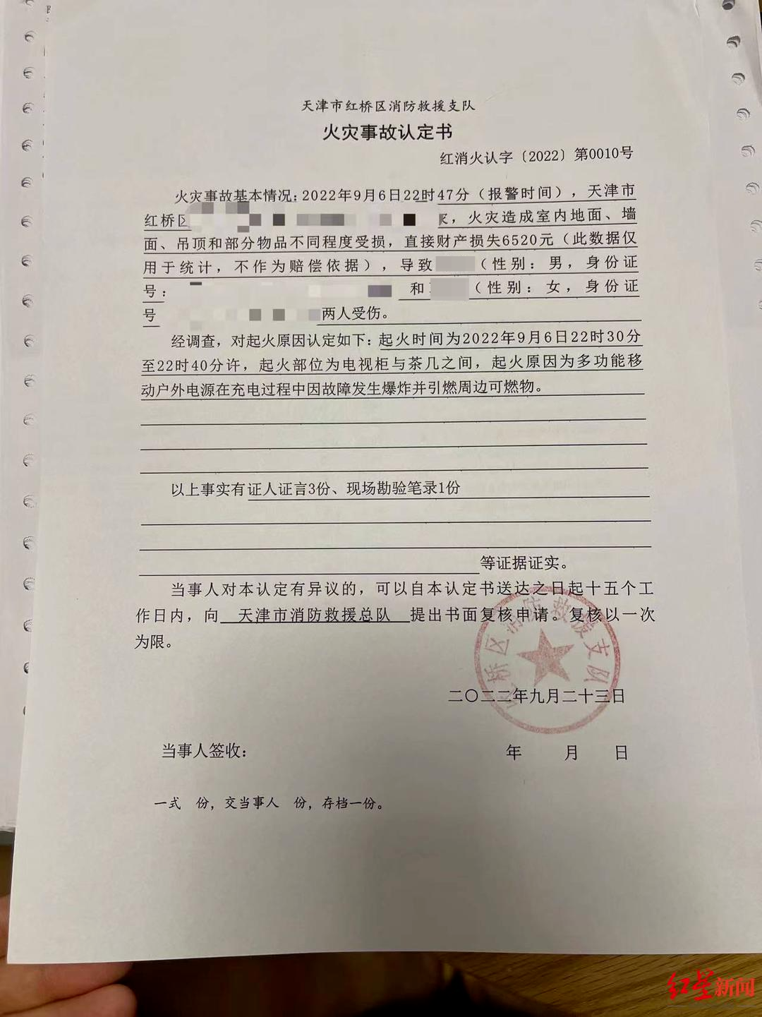 天津退休夫妻疑因移动电源爆炸被烧伤多次报病危,厂家称产品贴错牌愿赔40万