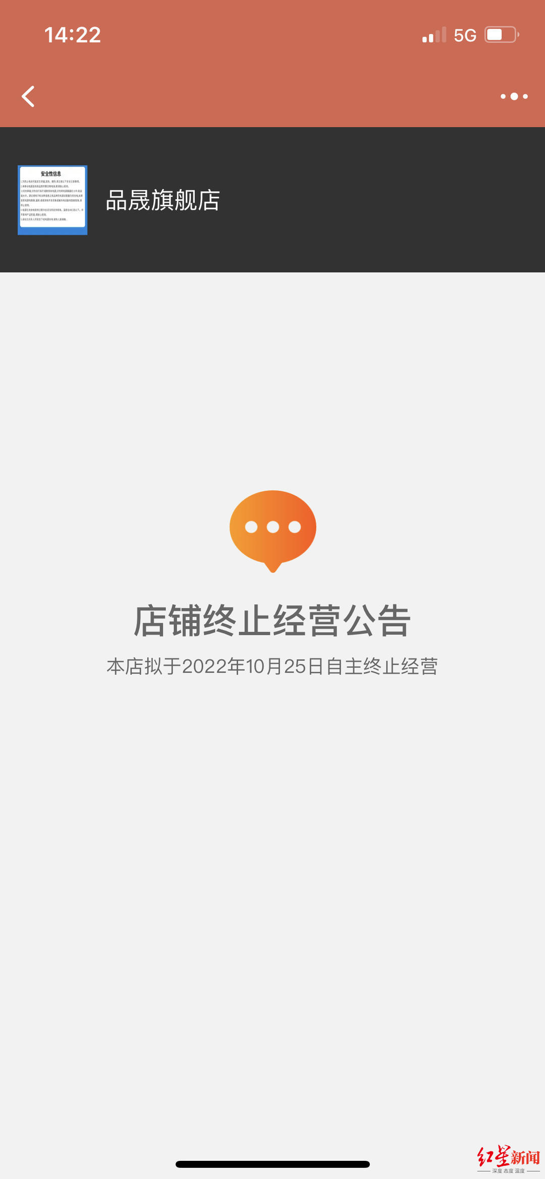 截至10月3日,红星新闻记者发现,卖家店铺已发布“终止经营公告”,上面显示本店拟于2022年10月25日自主终止经营,店铺头像上注有涉及安全性信息等内容。