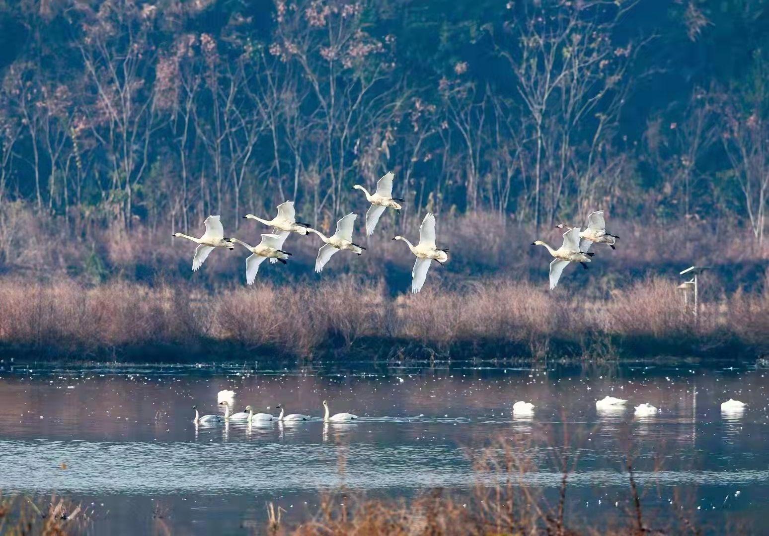 2012年10月,天鹅一群、两群、三群……陆陆续续有1000多只降临到一秀农场。此后,天鹅每年10月便来到农场,到次年3月再往北迁徙。天鹅的数量也越来越多,到2021年冬天,据钟吸秀夫妇观测已接近1万只。