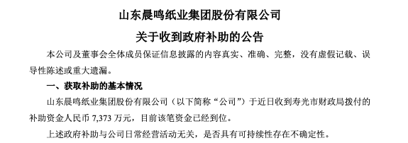 1月3日,晨鸣纸业公告称,收到寿光市财政局拨付的补助资金7373万元,目前该笔资金已经到位。预计将会增加公司税前利润7373万元。