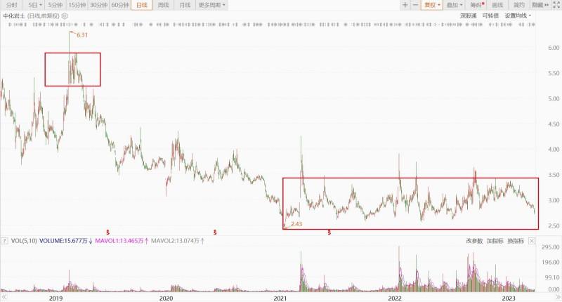 此后,中化岩土股价在3元/股(前复权)附近横盘调整至今,时间长度也在两年以上。