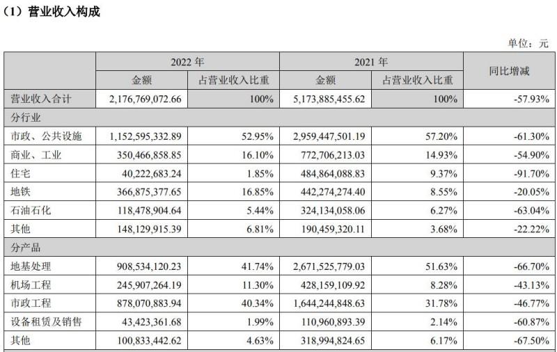 中化岩土于4月17日披露的2022年年度报告显示,2021年和2022年这两个亏损年度相互对比,2022年度的营业收入减少了57.93%,而归母净利润、归母扣非净利润的亏损分别扩大了124.44%、104.98%。