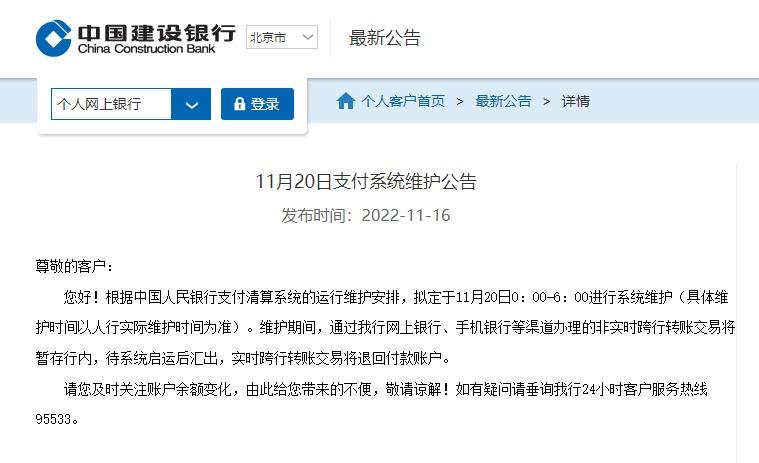 16日,建行发布《11月20日支付系统维护公告》,表示根据中国人民银行支付清算系统的运行维护安排,拟定于11月20日0:00—6:00进行系统维护(具体维护时间以人民银行实际维护时间为准)。维护期间,通过建行网上银行、手机银行等渠道办理的非实时跨行转账交易将暂存行内,待系统启运后汇出,实时跨行转账交易将退回付款账户。