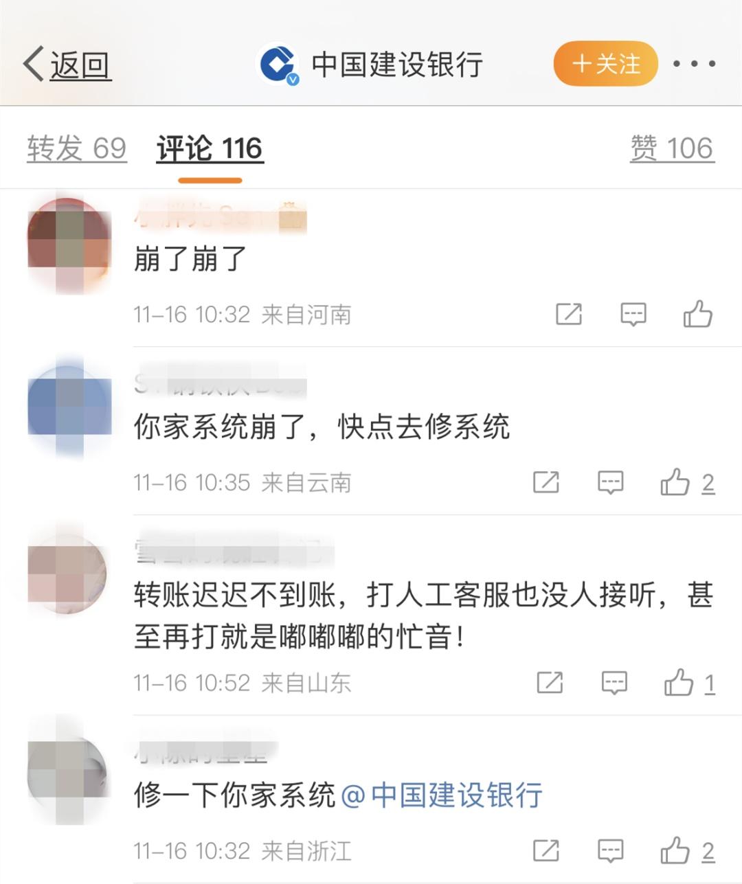 据报道,建行客服回应称,11月16日上午9:30后系统故障,无法办理各类账务、非账务交易。