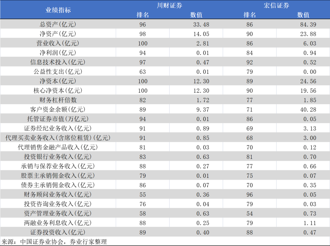 据中证协2021年度统计,川财证券营业收入排名第100、94位;投行业务收入排名第83位,其中债券主承销业务排名第86位。宏信证券营业收入、净利润分别排名第86、84位;投行业务排名第81位,其中债券主承销业务排名第70位。