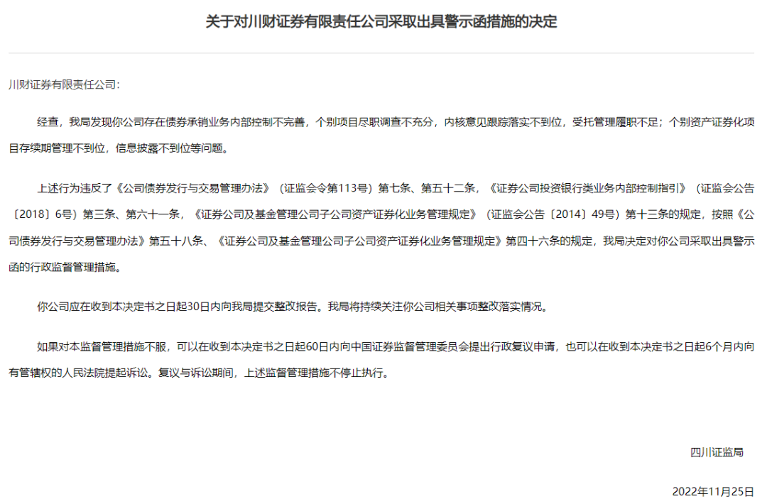 同日下发的〔2022〕70号监管函显示,川财证券存在债券承销业务内部控制不完善,个别项目尽职调查不充分,内核意见跟踪落实不到位,受托管理履职不足;个别资产证券化项目存续期管理不到位,信息披露不到位等问题。四川证监局同样予以警示,限期30天提交整改报告。
