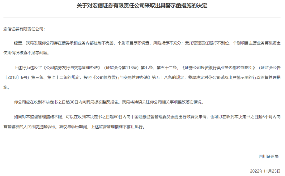 四川证监局〔2022〕69号监管函披露:因债券承销业务内部控制不完善,个别项目尽职调查、风险揭示不充分;受托管理责任履行不到位,个别项目主营业务募集资金使用情况核查不足等问题,四川证监局对宏信证券予以警示,限期30天提交整改报告。