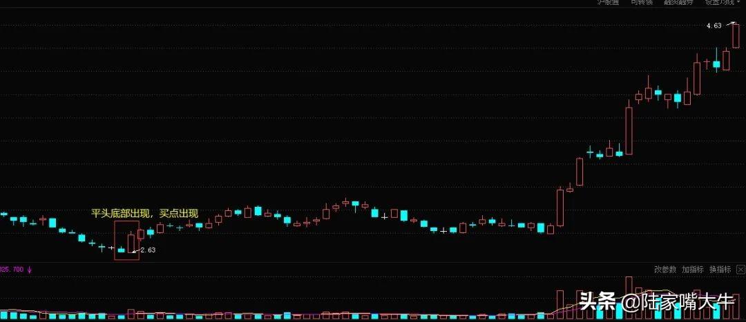 从上图中可以看到,该股在经过下跌后,在底部形成了平头底部形态,随即是企稳了,但是还是经过了长达两个月左右的震荡上涨,才开始大幅上涨。由此可见,K线平头底部是见底信号,但不是即将起爆的信号,这一点还是希望大家知道。
