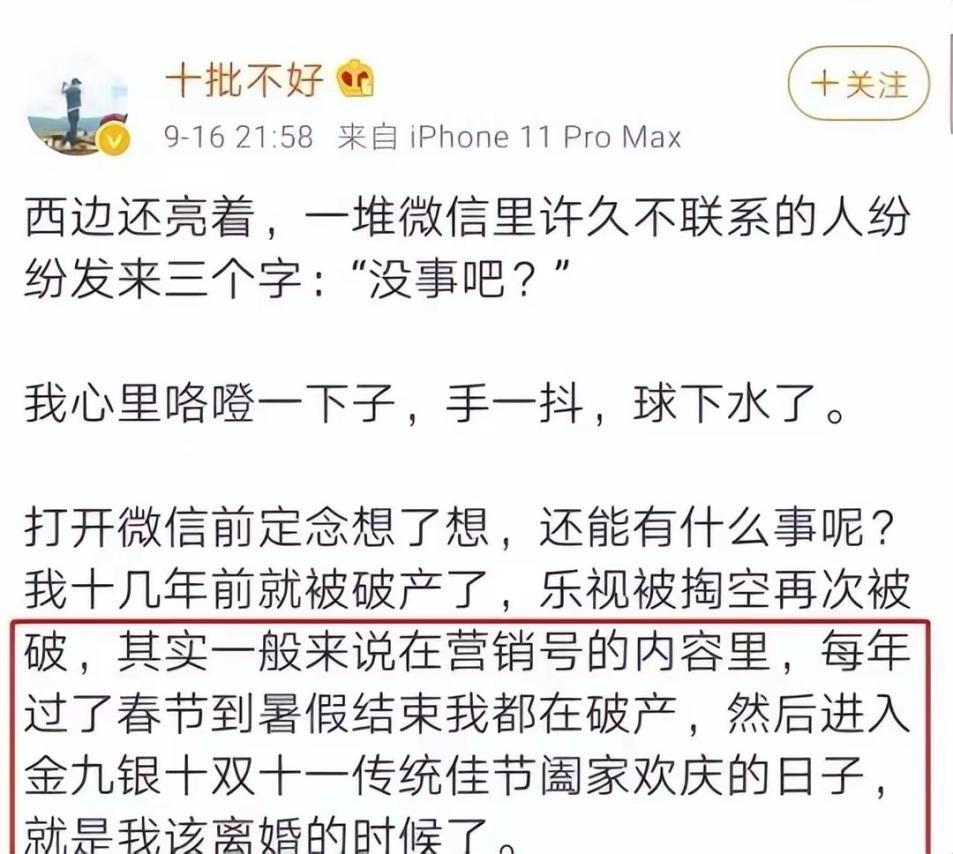 “每年过了春节到暑假结束我都在破产,然后进入金九银十双十一传统节日阖家欢情的日子,就是我该离婚的时候了。”