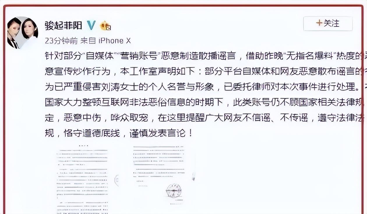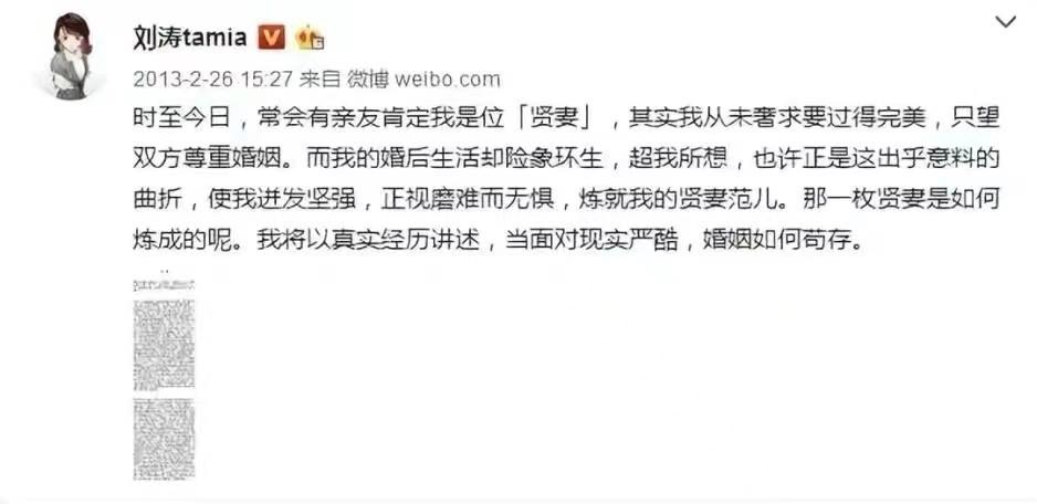 2013年2月,刘涛在社交平台上发表了一篇长文,