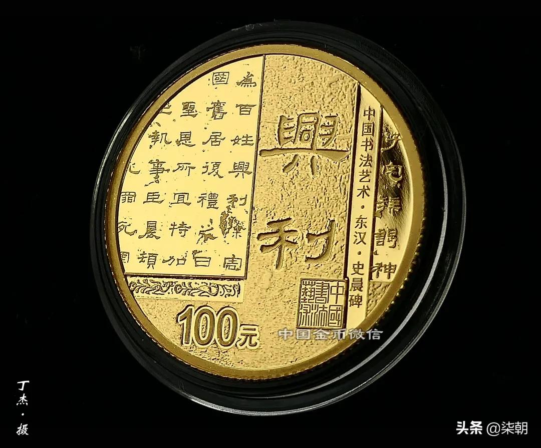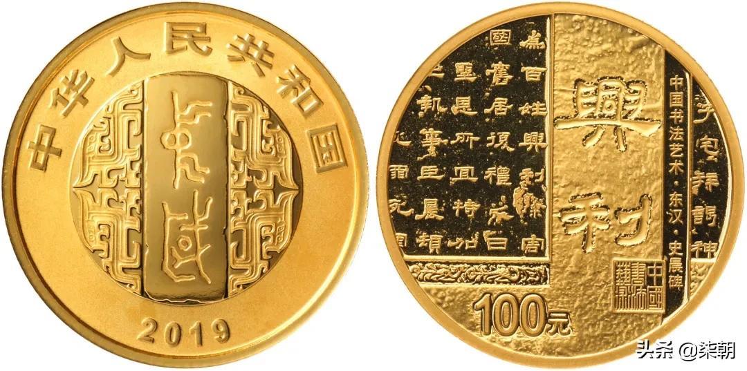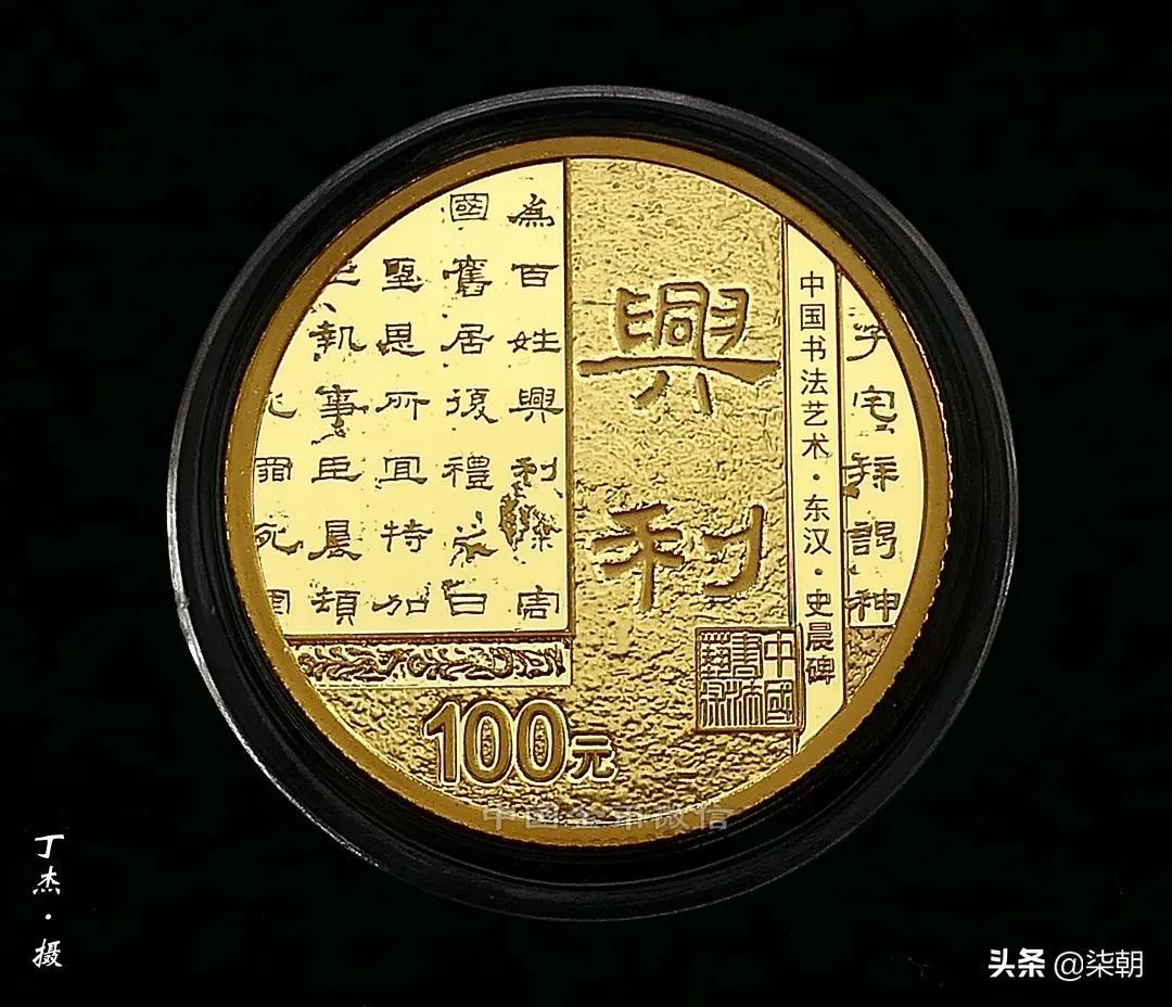 隶书金币正面图案为金文“中国”字样衬以青铜器装饰纹样,背面图案取材于东汉史晨碑,设计融历史文化、书法造诣与现实意义于一体,“为百姓兴利除害”更体现了国之风范。