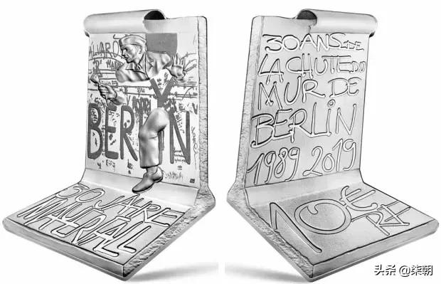 同为纪念“柏林墙的倒塌”30周年,法国发行的这枚银币最大的特点,就是利用视错觉原理将平面立体化。整枚币看起来就像是一本日记,记录着柏林墙倒塌这一历史事件,币面正背面的主题文字、年号、面额等都采用手绘图案,与整体设计风格高度统一。正面图案中一名德国军人手持玫瑰穿过绘满涂鸦的柏林墙,不难想象他正迫不及待地与自己的爱人相见。无论是画面还是文字,都是当时那段历史的形象演绎。
