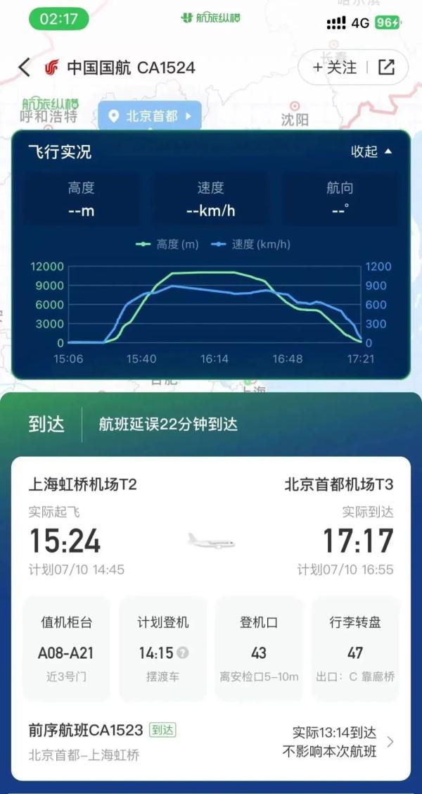 据航旅纵横APP显示,7月10日,国航CA1524航班为15时24分从上海虹桥机场起飞,17时17分降落于北京首都机场。执飞该航班的飞机机型为空客A330。