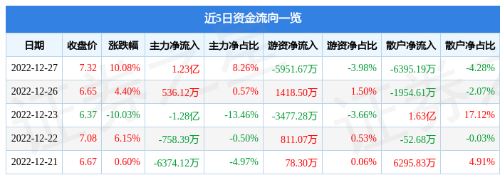 12月27日的资金流向数据方面,主力资金净流入1.23亿元,占总成交额8.26%,游资资金净流出5951.67万元,占总成交额3.98%,散户资金净流出6395.19万元,占总成交额4.28%。