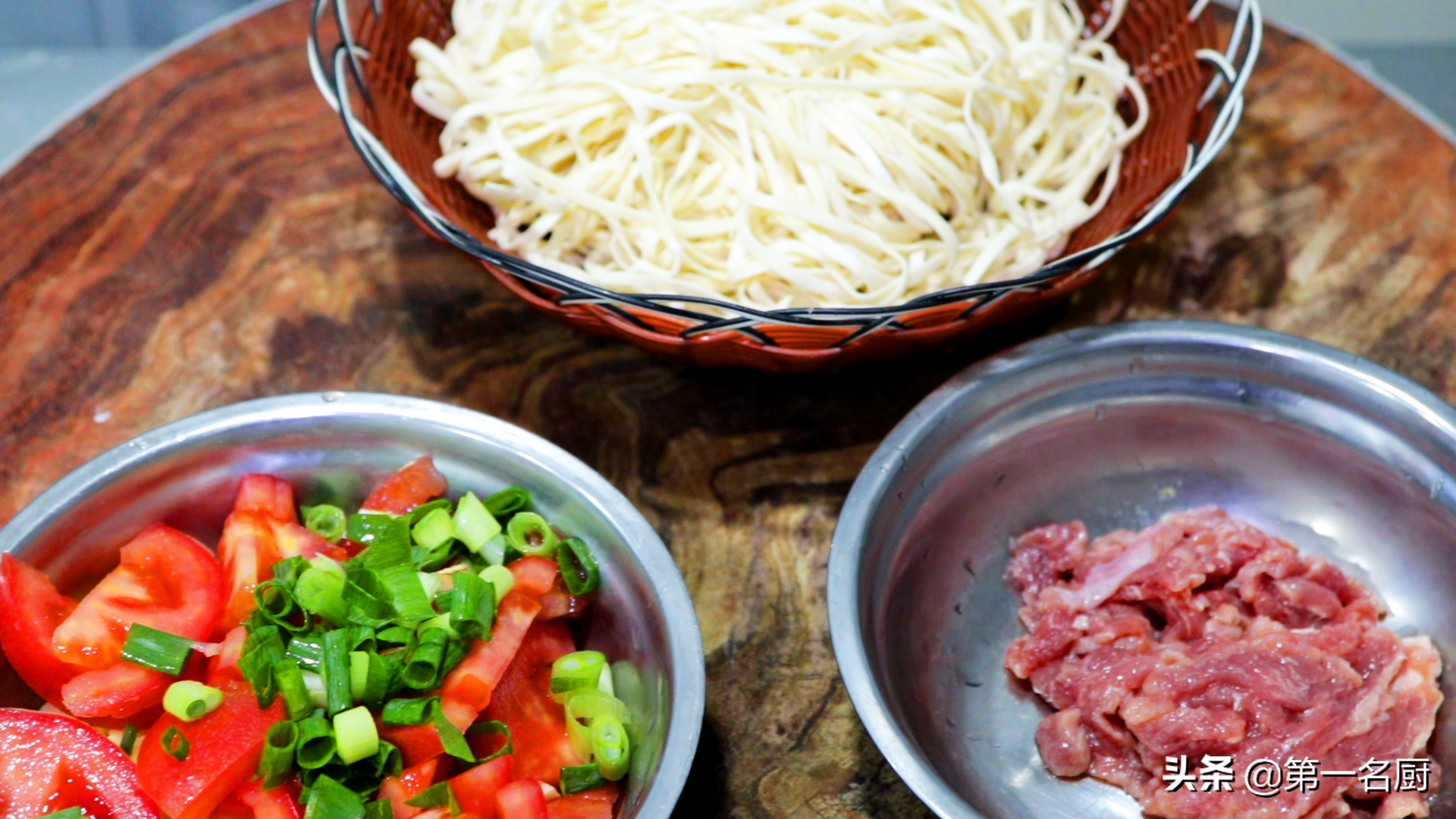 生面条一斤左右备用,削皮的土豆一个,切成土豆丝,西红柿一个切成片,小葱一根切成葱花,一起放入盆中备用,猪瘦肉一块,切成肉丝装入盆中。